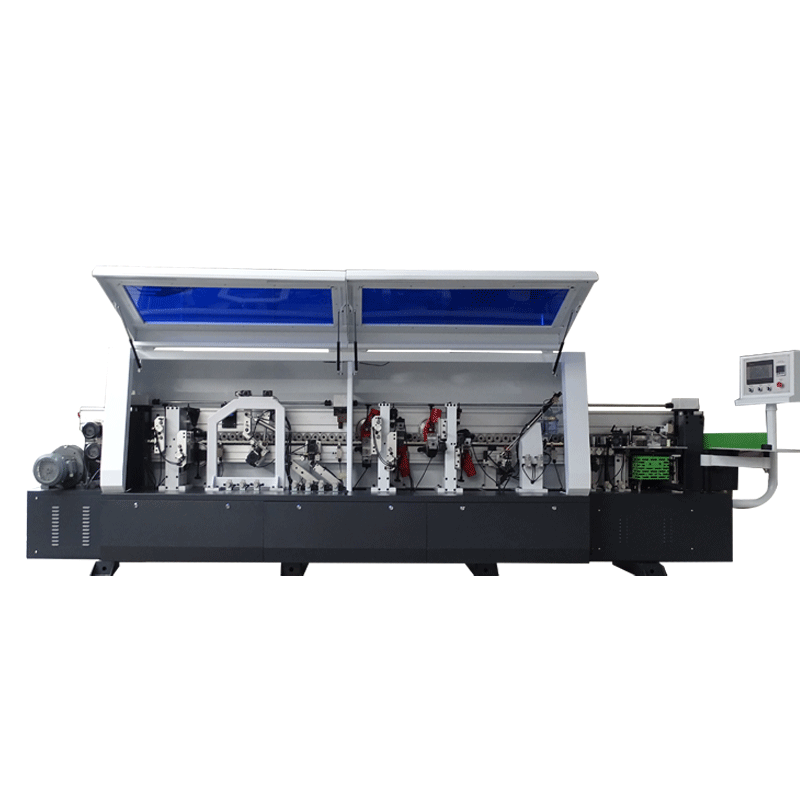 主要包括機身、各加工部組、控製係統。加工組件主要有:預銑、塗膠、封邊、齊(qí)頭(tóu)、粗修、精修、仿形跟蹤、刮邊、拋(pāo)光、開槽。