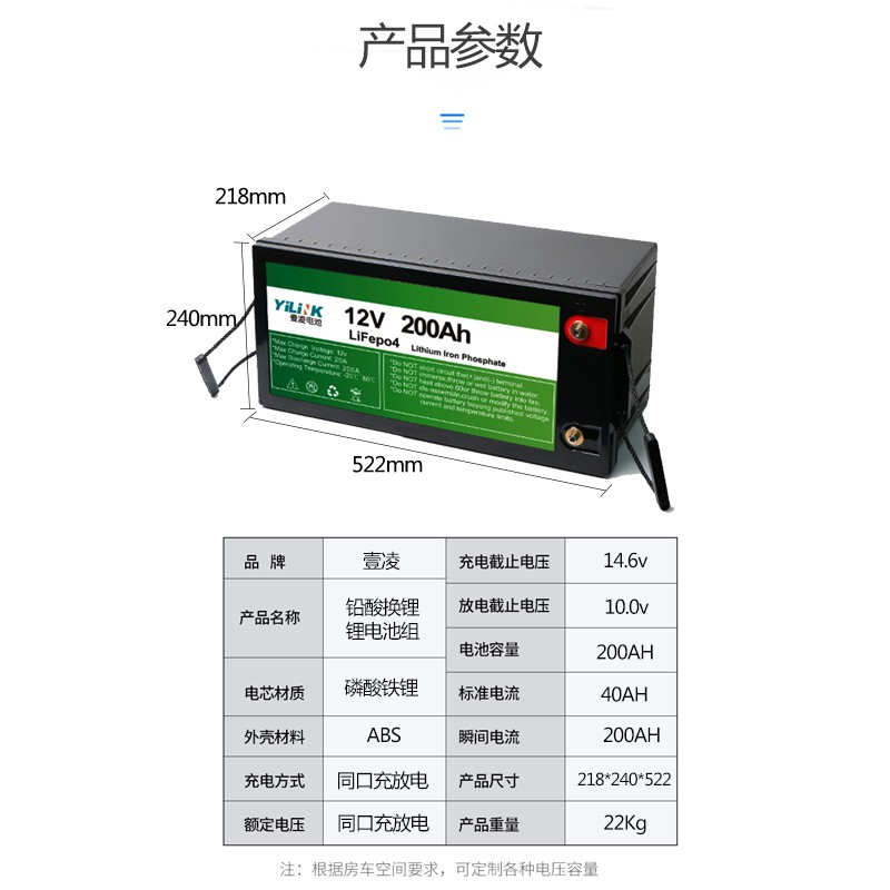 12.8V/200Ah 鉛換改鋰鋰電池 產品編號:YL12.8200 電芯(xīn)型號:大單體3.2V200AH 電池規格:4串1並 標稱電壓:12.8V 標稱容(róng)量:200Ah 充(chōng)電電壓:14.6V 充電電流:50A 放電電流:100A 瞬間放電電流:200A 放電截止電壓:10V 成品內阻:200mΩ 電池重量:20Kg 產品(pǐn)尺寸:522*240*218mm(Max) 充電溫度:0~45℃ 放電溫度:-20~60℃ 存儲溫度:-0~40℃ 溫度保護:65℃ 電池外殼:PC 鋰電保護:短路保護(hù),過充保護(hù),過放保護,過流保護,溫度保護,均衡等 應用領域:太陽能光伏儲能 ,太陽能路燈(dēng),電(diàn)動叉車,房車後備電源