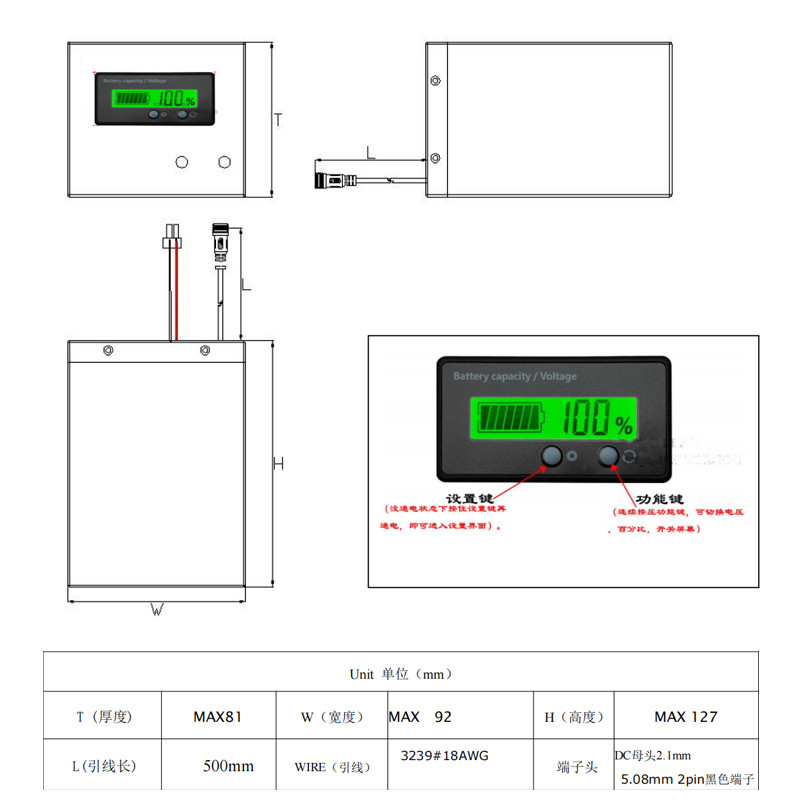 14.8V/15Ah 閘機後備電源 產品編號(hào):YL14815 電芯型號:18650 電池規(guī)格:4串5並 標稱電壓:14.8V 標稱容量:15Ah 充(chōng)電電(diàn)壓:16.8V 充電電流:7.5A 放(fàng)電(diàn)電流:15A 瞬間放電電流:20A 放電截止電壓:12V 成品(pǐn)內阻:200mΩ 電池重量:1400g 產品尺寸:81*92*127mm(Max) 充(chōng)電(diàn)溫度:0~45℃ 放電溫度:-20~60℃ 存儲溫度:-0~40℃ 溫度保護(hù):65℃ 電池外殼:鈑金(jīn)鑄鐵 鋰電保(bǎo)護:短路保護(hù),過充(chōng)保護,過放保護,過流保護(hù),溫度保護,均衡等 應用領域:安(ān)檢閘機備用電源