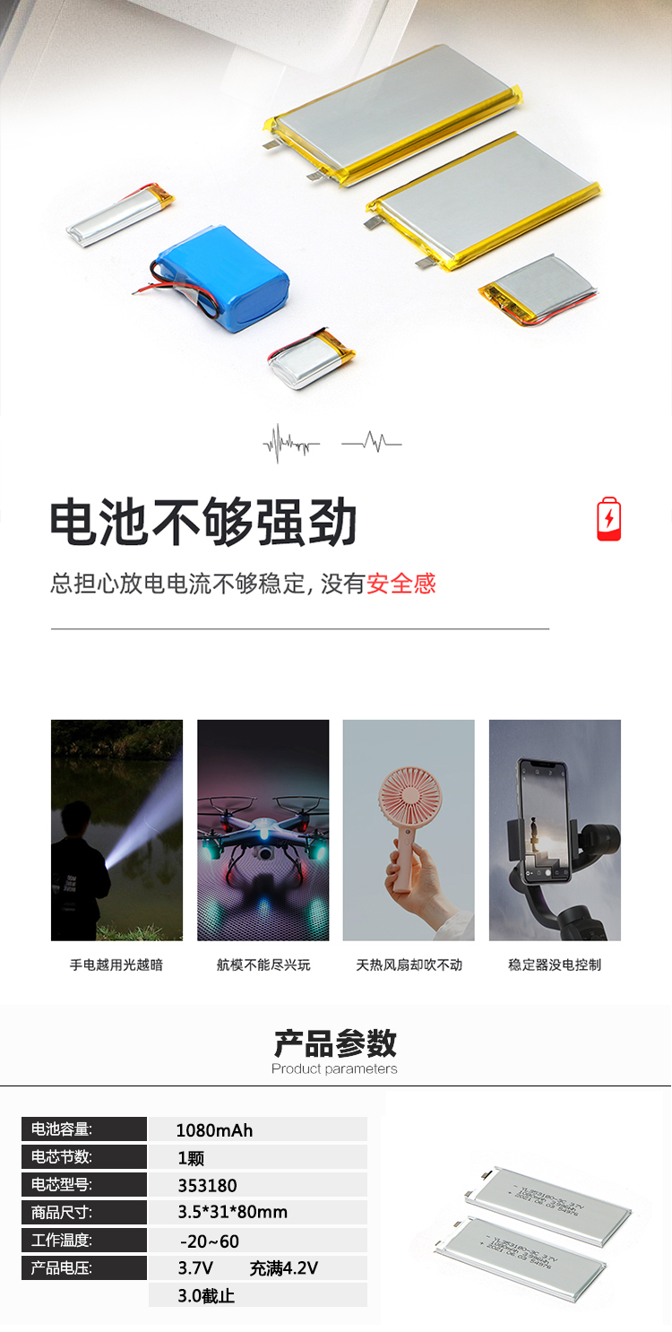 品牌:91网站 加工定製:是(shì) 電(diàn)池類型(xíng):聚合物鋰電池 標準電壓:3.7V 外型尺寸:3.5*31*80(mm) 容量:1080mAh 適用類型:電動工具鋰電池(chí) 儲存溫度:-0℃~45℃ 工作溫度:-20℃~60℃