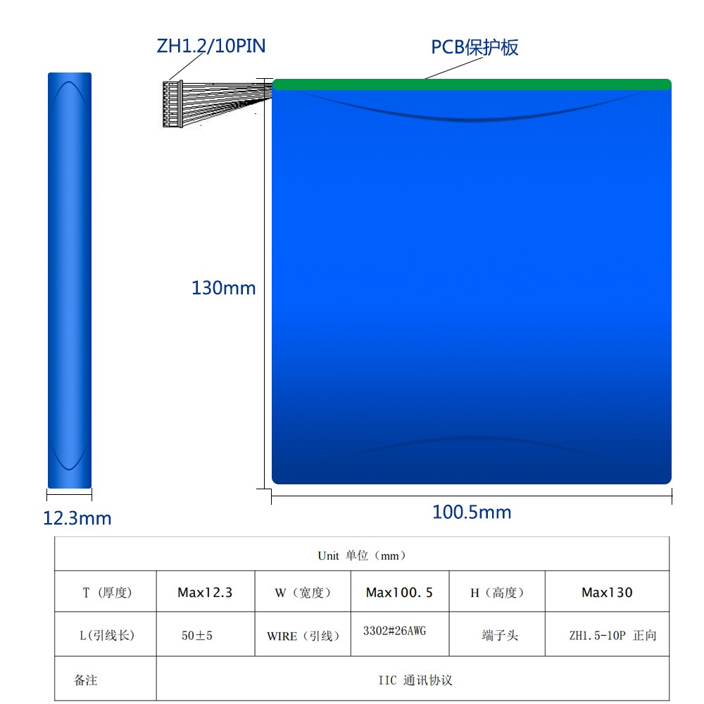 3.7V6800mAh 工業(yè)平板(bǎn)鋰電池 電芯型號:39100125/3.7V/6800mAh 電池規(guī)格:39100125/11.1v/6800mAH 標稱電壓:11.1V 標稱(chēng)容量:6800mAh 充(chōng)電(diàn)電壓:12.6V 標準充電電流:1360mA 標準放電電流:1360mA 瞬間(jiān)放電電流:3200mA瞬間(5A) 放電截(jié)止電壓:9V 成品內阻:200mΩ 電池重量:335g 產品尺寸(cùn):12.3*100.5*130mm(Max) 充電(diàn)溫度:0~45℃ 放電溫度:-20~60℃ 存儲溫(wēn)度:-0~35℃ 電池外殼:無 鋰(lǐ)電保護:過衝/過放/短路(lù)/過流/i2C電量協議 應用領域:工業平板