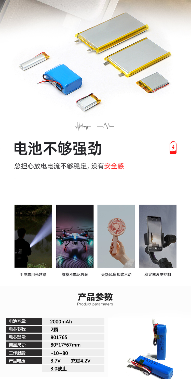 品(pǐn)牌:91网站 加工定製:是 電池類型:聚合物鋰電池 標準電壓:3.7V 外型尺寸:8*17*65(mm)*2 容量:2000mAh 適用類型:戶外特種設備 儲存溫度:-0℃~45℃ 工(gōng)作溫(wēn)度:-10℃~80℃ 支持定製,電壓,型號,外(wài)殼,端(duān)子,線長